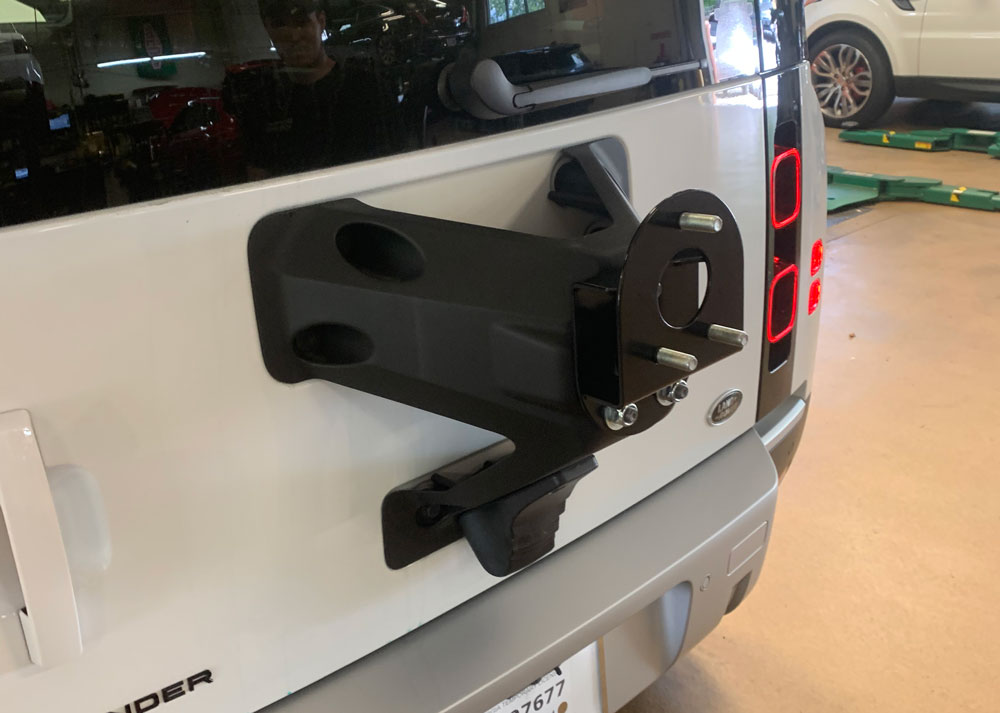 With our larger, wider tires this offset tire carrier can handle the weight not to mention keeping the tire away from the wiper arm and rear bumper. Find it at Lucky 8*.