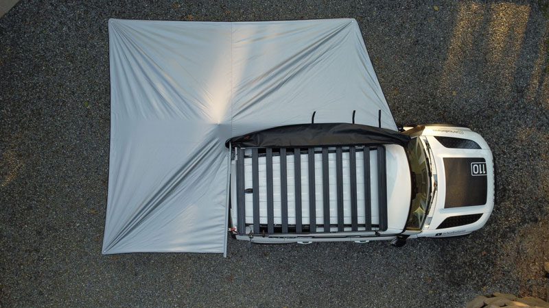 There is so much space under this awning to protect from the sun, rain, etc.  Setup and takedown is easy without poles to pitch. Product info found at Alu-Cab