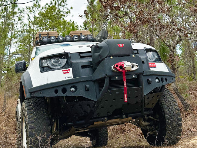 Custom built aluminum front bumper provides aggressive look, increased clearance, and easily accessible winch. Big thanks to Sarek Autowerke.